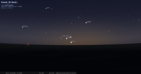 Devant le Taureau (Tau) ; longitude écliptique 16e GEM, il se couche à 22h11 pour notre localisation, soit 52 minutes après le Soleil.
