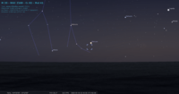 devant la Licorne (Mon) jusqu’au 29 mai puis Orion (Ori), elle s’élève en déclinaison ; elle deviendra visible en juillet pour nos latitudes quand elle arrivera devant le Taureau (Tau) puis le Cocher (Aur)